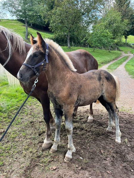 We are selling our Black Forest Coldblood colt foal from June 2025. He is a friendly and typy young stallion. At the foal inspection in Waldkirch-Kohlenbach, he was awarded 33 points / top silver.