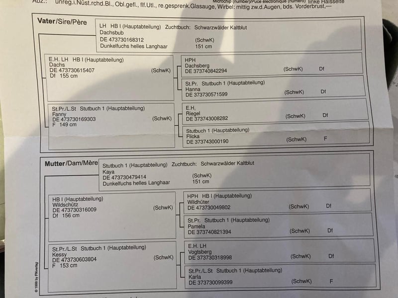 Wegen Bestandsminderung suche ich für meine Schwarzwälder Kaltblut Stute ein neues Zuhause. Die Stute ist im Mai 2022 geboren, und wurde mit ca. 1,40 cm gemessen. Sie ist dem Alter entsprechend leicht gefahren und geritten. Dachsbub x Wildschütz Bei Interesse gerne melden.