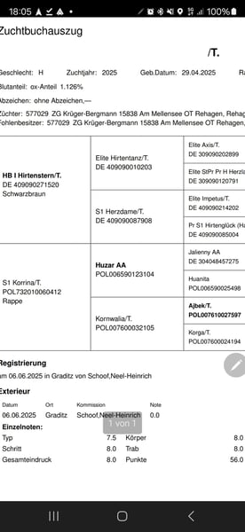 Ce hongre athlétique se distingue par ses trois allures très bonnes et son tempérament facile. Avec une note de 56 points, il s’est qualifié pour le championnat des foals. Il a obtenu un 9,0 en galop ! Sa nature amicale et ses bonnes bases en allures en font un partenaire idéal pour les cavaliers ambitieux à la recherche d’un poulain prometteur. Son père, Hirtenstern, impressionne par sa grande facilité de dressage et connaît beaucoup de succès en épreuves pour jeunes chevaux. La mère, Korrina, possède un sang de performance rare, avec la lignée nécessaire.