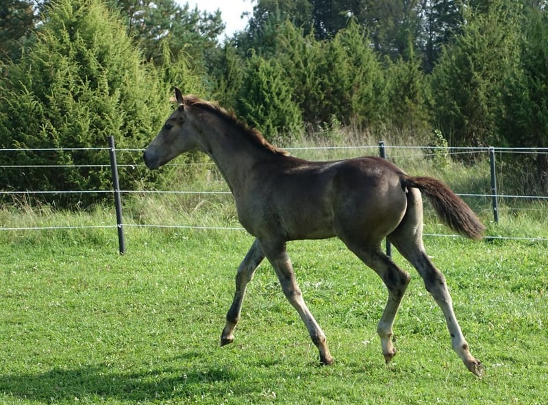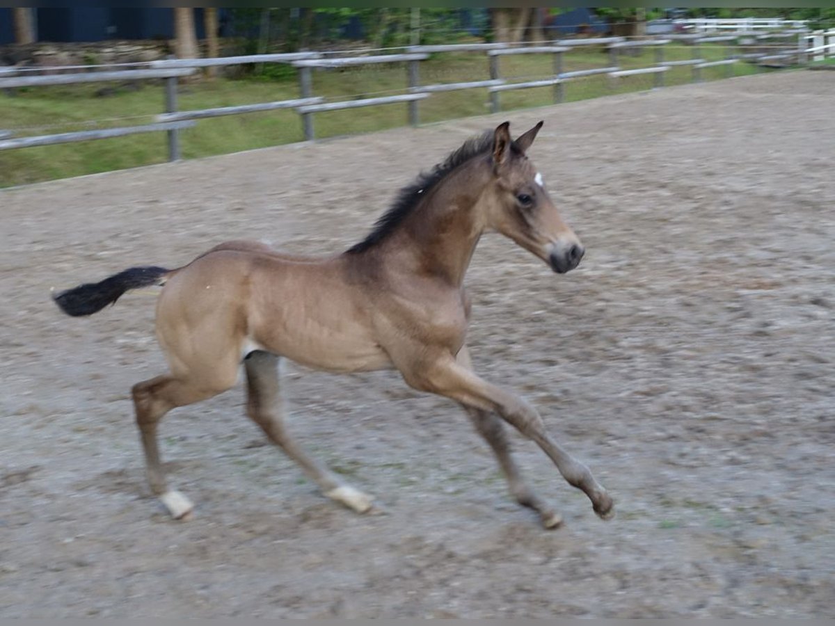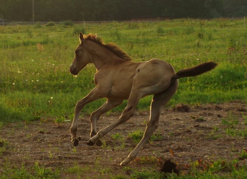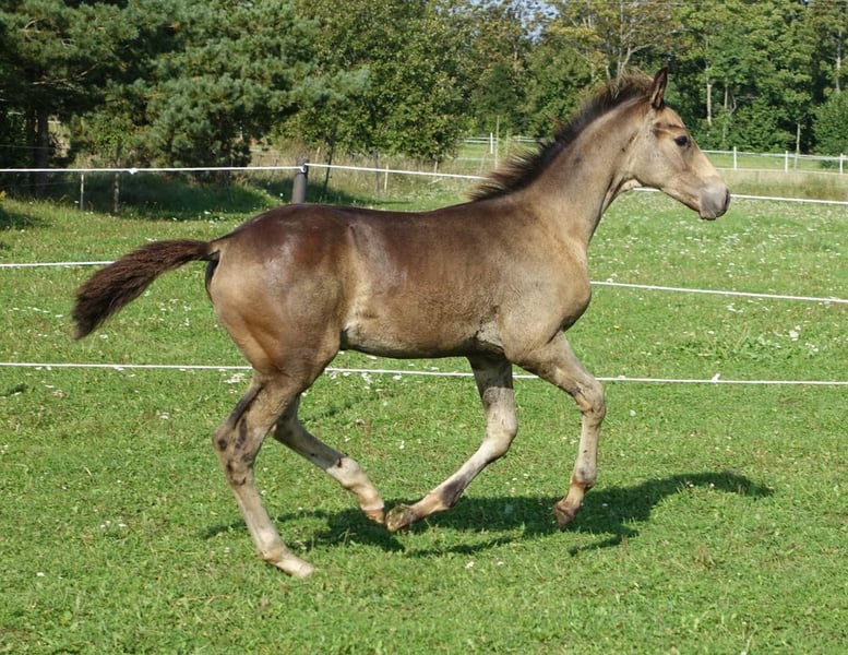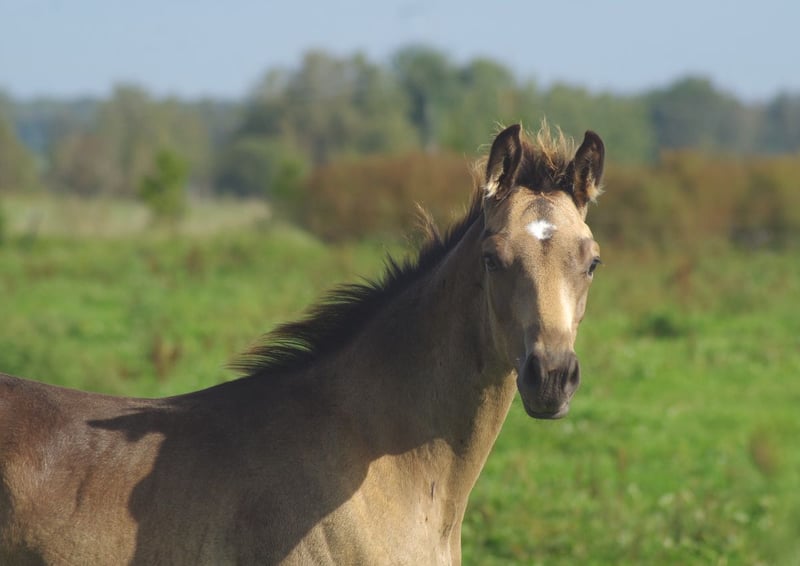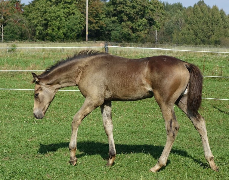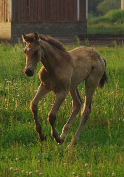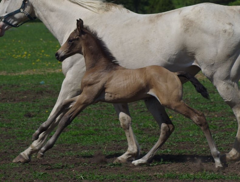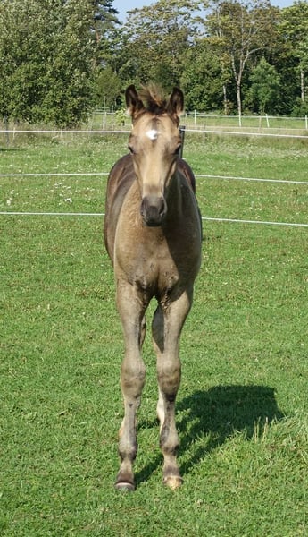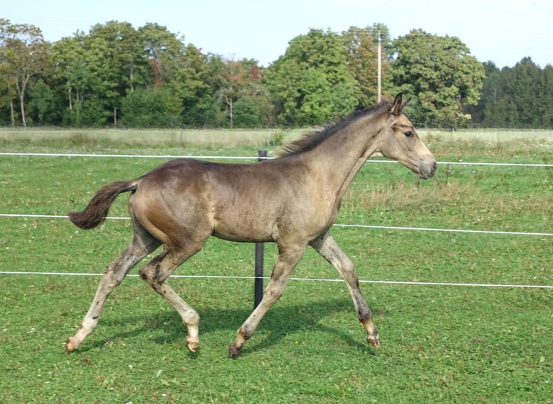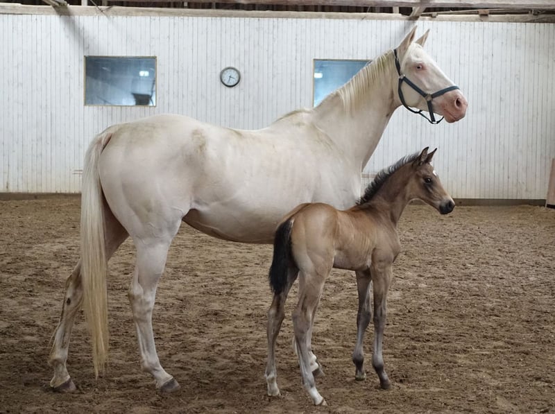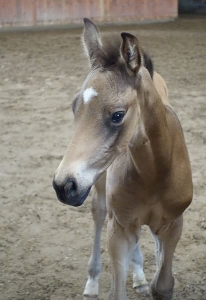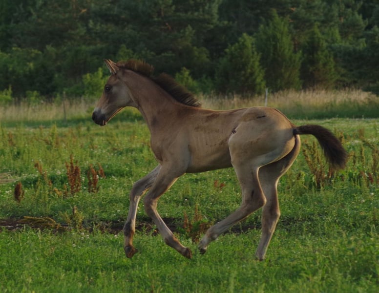 Very special BUCKSKIN TRAKEHNER colt by MILLENNIUM himself. I am quite sure he is the first BUCKSKIN Millennium Trakehner foal, possibly the only buckskin Millennium foal at all- which makes him totally unique. Millennium himself probably needs no introduction. Trakehner stallion of the year 2022 and most successful Trakehner stallion in these days. He has successfully competed Grand Prix level himself and the same time he has already given more than 100 licenced sons- and not only in Trakehner studbook. He also shares the sire (Easy Game) with double Olympic champion TSF Dalera. Dam of the colt is very well graded and extra rare cremello Trakehner mare Elektra KA by thorouhbred stallion Goldmaker xx. Dam´s dam was russian-bred mare by dressage stallion Ekwus, damdamsire is Ashabad- Belorussian national grading winner with top scores both in jumping and movement and later also successful Grand Prix dressage stallion. The damline goes back to mare Ennam who herself directly gave 2 Grand Prix stallions- one of them (Enisey) was also part of Olympic dressage team in Moscow 1980. It is a correct and goodmoving colt with beautiful Trakehner look. He is expected to become a tall horse, the dam is an impressive 177 cm at withers. Espresso Macchiato has wonderful and kind character and is very easy to handle. Do not miss that true rarity. The colt has been weaned, properly handled and is ready to move worldwide. Shipment from Estonia to Germany 700-800 EUR. palominotrakehners@gmail.com