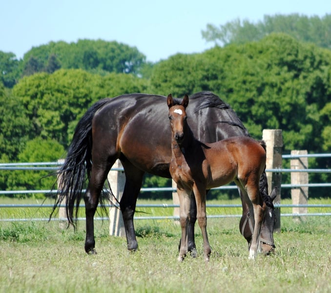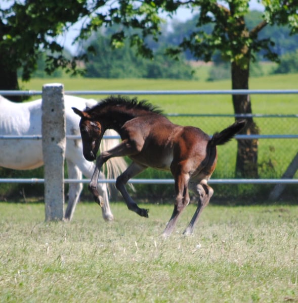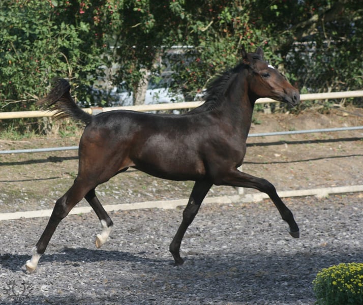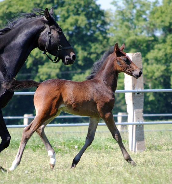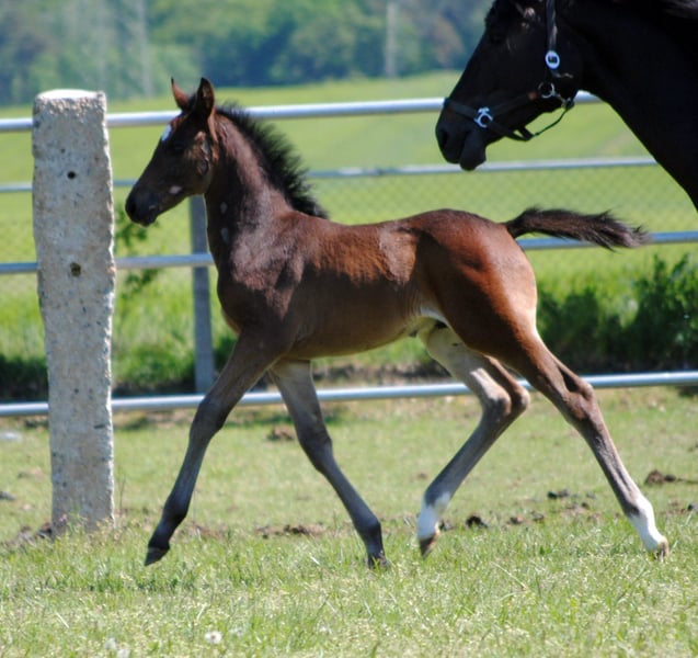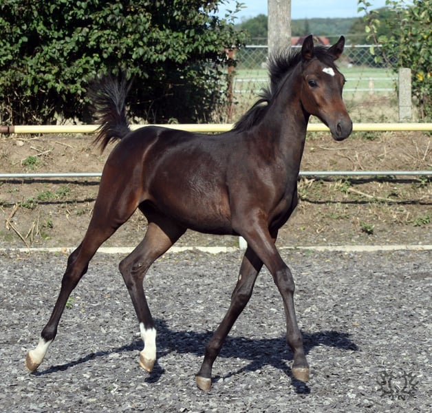 Born on April 5, 2024, the dark bay Le Champ TN was the absolute favorite of the audience at the foal registration. His knee-accentuated movement from a very active hindquarters and the pronounced Trakehner breed type made him the favorite in the evaluation by the breeding management. His pedigree also leaves nothing to be desired. His sire is the half-breed Pr.H. Le Chevalier TN, son of the powerful thoroughbred Cavallieri xx - winner of the Nurmi test and winner of the HLP for eventing horses in Marbach. Dam La Perfekta TN, a daughter of the Russian military stallion Perfekt and in another falling line Pr.St. Lara TN by Elladi II, a half-sister of our international military horse Traumprinz TN. Brilliance of type, correctness of foundation and outstanding uphill movements led to the highest rating, a 3-star premium and the recommendation to breed him as a stallion.