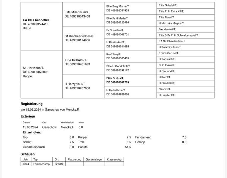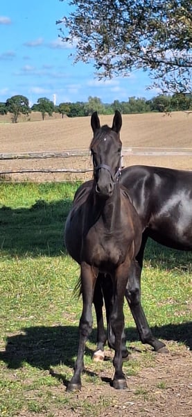 Young, growing stallion with excellent performance bloodlines, in a black-brown coat. Born on April 23, 2024, awarded 1c Premium Graditz. Pedigree and foal evaluation available in the photo. Raised in a herd in a stallion upbringing, never been ill or had any issues so far. Location: 17089. Transport possible at the buyer's expense, also to other European countries.