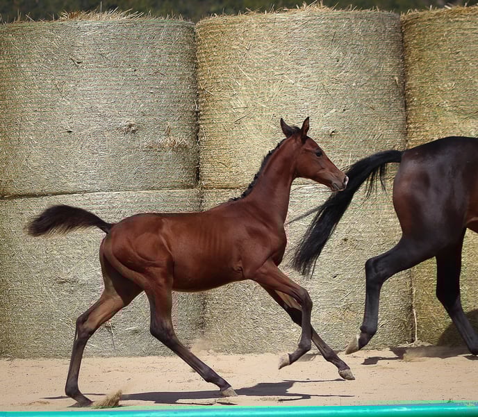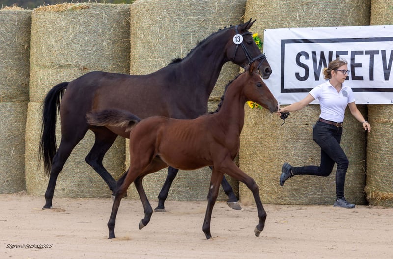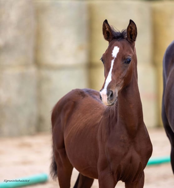 VOLLTREFFER wird auf der Sweetwater Stud Autumn Sale 2025 angeboten. Die Auktion läuft vom 12.11. bis 19.11.2025. Bid Up startet um 19:00 Uhr MEZ. Registrieren und mitbieten können Sie sich unter https://auction.sweetwater-stud.com/auctions Dieses Prämienfohlen (55,5 Punkte) ist von Mutter- wie Vaterseite blutgeprägt. Ausgestattet mit sportlichen Points, großen Linien, korrektem Fundament und guten Grundgangarten, präsentiert er sich stets elegant, selbstbewusst und stolz. Dalton Vra AA hat mit seinem ersten Jahrgang bei uns wahrhaftig Akzente gesetzt! Er verbesserte jede einzelne Beurteilungsposition, und die Gesamtpunktzahl um ganze 3 Punkte! Ein leistungsgeprüfter Anglo-Araber, der in Dänemark sowohl in Dressur wie auch Springen Erfolge bis zur Kl. M vorweisen kann. Vater von Dalton Vra AA ist der Shagya-Araber Dartan. Diese Hengstlinie geht zurück auf den Araberhengst DAHOMAN, geboren 1846. Die Dahoman-Linie zeichnet sich durch einen starken Rahmen, hervorragende Knochen, Zähigkeit und Ausdauer aus. Seine Mutter Donna Vra AA ist eine Tochter des im Springsport hocherfolgreiche DON-CASTER AA von DORPAS AA, intl. Springen bis Klasse S** mit Dirk Schröder (u.a. 1.Platz CSI Neustadt/Dosse). DON-CASTER AA ist auch Vater von JUMEAUX RH AA (Springen in VS bis Kl. M2*) und ein mütterlicher Halbbruder zu BONAPARTE N AA, NABUCCO AA. Seine Grossmutter Piroutte Vra AA stammt von PRIMUS AA, ein Sohn des berühmten MATCHO AA (NK-LGS 578.029,-- €), dessen Nachkommen vielmals in Dressuren hocherfolgreich waren. Er ist Vater von 37 S-Dressurpferde, 8 S-Springpferde, 1 S-VS-Pferd und 7 S-Fahrpferden, hauptsächlich Hannoveraner. Das Pedigree verspricht von beiden Seiten Doppelveranlagung. Volltreffer ist das erste Fohlen der Assistent-Tochter, Vanora, die anlässlich der Fohlenschau als Prämienanwärterin eingetragen wurde. Die zweite Mutter Pr.u.St.Pr.St. Varda v. Pamir I ox absolvierte als Reservesiegerin 2012 die Projekt Nurmi-Prüfung mit Traumnoten (u.a. im Freispringen für Manier und Vermögen, sowie für den Renngalopp bekam sie eine 10!). Sie ist Vollschwester zu dem beim ZSAA gekörten Voltaire. Elitehengst Pamir I ox, überlegener Sieger der HLP 1994 im 100 Tage Test war (Gesamt Index 136.82) und von mehreren Warmblutzuchtverbänden und dem Trakehner Verband anerkannt war, ist Vater von fünf gekörten Söhnen, wie Shalimar ox, Dschandru ox, DSCHEIM ox, SAID ox und dem Trakehner Voltaire. Rittigkeit, Bewegungsstärke und dessen vorzüglicher Charakter prägen sowohl die charmante und menschenbezogene Vanora, wie auch bereits erkennbar ihren Sohn von Dalton Vra AA. Im fallenden Stamm findet man weiter den Derbysieger Amiant xx, ein außergewöhnlich korrekter, charakterlich einwandfreien, wertvollenh Vollbluthengst. Im fallenden Mutterstamm findet man die St.Pr.St. Venus, eine Tochter der St.Pr.u.E.St. Vermutung, die Mitglieder der Siegerfamilie der Landesschau 1992 in Graditz waren. Ebenso findet man mütterlicherseits das Blut des Ralf, welcher als absoluter Ausnahmevererber der gesamten Sportpferdezucht der DDR galt und erfolgreiche S-Pferde in allen drei Disziplinen hervorbrachte. Muttervater ist der Marbacher Hengst Assistent, der selbst sportlich bis Klasse M erfolgreich und für mehrere Warmblutzuchtverbände gekört bzw. anerkannt war. Vater zahlreicher erfolgreicher Sportpferde in allen drei Disziplinen. Stutenfamilie/mare line: O402A Verona - Gut Kölsa https://auction.sweetwater-stud.com/auctions
