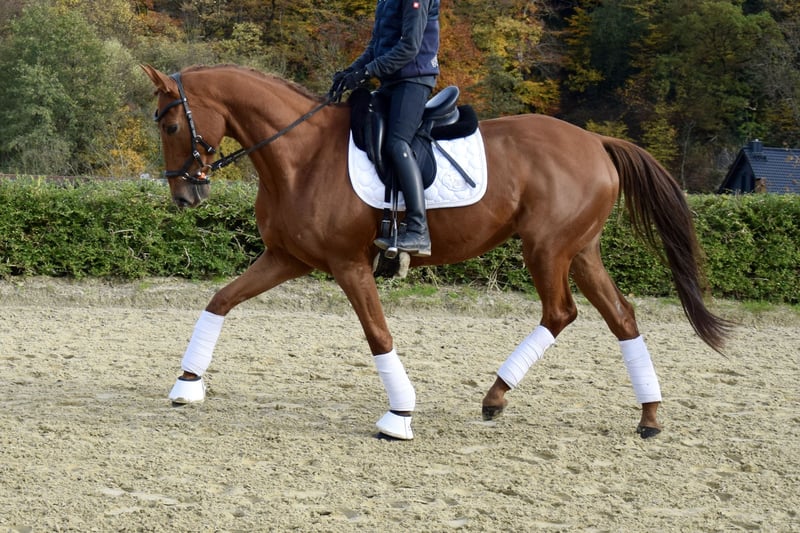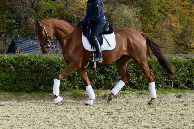Don is a 2015-born Trakehner chestnut gelding sired by Burma Gold xx out of Oxford x Trafaret. He impresses people with his friendly and straightforward nature. He is easy to ride with minimal effort and always provides his rider with a confident, secure feeling, making every ride enjoyable. Groundwork, lunging, cavaletti exercises, and hacking are also part of his daily routine. The Trakehner gelding is accustomed to spending his day in a group on the paddock or pasture. He comes directly from the breeder, is vaccinated, dewormed, and regularly presented to the farrier (barefoot). Further information available upon request. Location: 42579.