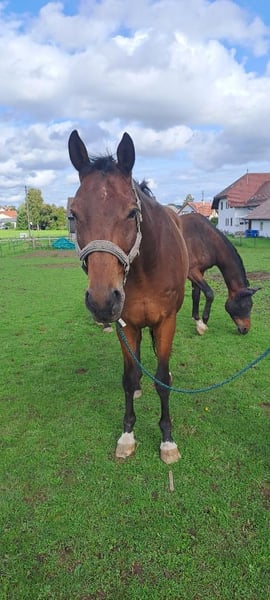 Vendo un elegante caballo de deporte Trakehner, yegua, ideal para ocio Se ofrece un hermoso caballo Trakehner de color castaño, nacido en 2010. Con una altura de 1,75 m, destaca por su imponente tamaño y su apariencia armoniosa. ¡Mounty ya no debe ser utilizado en clases de escuela! Está entrenado en doma clásica y ha obtenido buenos resultados en competición, pero debido a una nerviosidad en la parte trasera, se retiró del deporte de competición. Está bien entrenado, es confiable en el manejo y es perfecto para paseos largos, excursiones y paseos relajados en tiempo libre. Su carácter amistoso lo convierte en un compañero ideal para jinetes de todos los niveles de experiencia. Ha sido utilizado varias veces en programas de verano para niños; por ello, también podría ser adecuado como caballo de terapia. Como lo adquirimos con problemas en los cascos, ha estado los últimos dos años sin herraduras, lo que ha mejorado mucho la salud de sus cascos. Se le realiza una revisión con el herrero cada 6 semanas. Actualmente, Mounty vive con dos jóvenes caballos en un pequeño establo privado, donde tiene una boxe cómoda por la noche y pasa el día al aire libre. ¡No debería volver a estar en un establo cerrado! Es dominante con los dos jóvenes caballos, pero de manera tranquila, sin pelear ni empujar. Busca un hogar donde pueda disfrutar de muchas salidas y paseos con su humano, y en el que pueda envejecer feliz y satisfecho. Para más información o si está interesado, no dude en contactarme. Será un placer conocerlo en persona en cualquier momento.