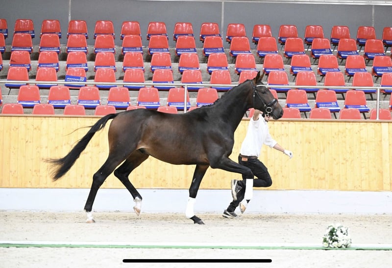Large-framed Trakehner colt (2½ years old) with impressive presence and promising sporting potential. Currently approximately 16.1 hh. This young stallion impresses with elastic basic gaits, full of drive, rhythm, and natural balance. Already gently lunged and happily free-jumping – always attentive, honest, and with a great sense of overview. Caitano’s dam, St.Pr.u.Pr.St. Chica by Herbstbach – Germanicus Rex, is on the verge of receiving the elite mare title from the Trakehner Verband. She was a 1b prizewinner of the jumping mares at the Federal Mare Show in 2014, as well as reserve champion and best jumping mare of her mare registration. His sire, Santo Scuro, was appointed as an elite candidate in the Trakehner Verband at just five years old – the youngest stallion to receive this distinction. He impresses with rideability, strong character, correctness, and outstanding health status. He completed his 50-day test in Stadl-Paura with flying colors, achieving an overall score of 8.48 as the top three-year-old stallion in his lot. His ratings in rideability and interior (both 9.30) highlight his exceptional character, high willingness to perform, and aptitude for sport. In daily handling, Caitano is people-oriented, affectionate, and very easy to deal with. He is clear-minded, brave, and reliable, with excellent manners and trust in humans. Raised in healthy, species-appropriate conditions with daily turnout and loving care. Regularly vaccinated, dewormed, and presented to the blacksmith. An exceptionally charming young stallion with excellent potential for the future – a true lifelong partner! Caitano is undoubtedly a future candidate for the big arena. Due to his impressive trot and good jumping ability, we can also very well imagine him excelling in eventing. Castration is expected to take place in early November. Feel free to visit our Instagram page Trakehnerhof_hegelerwald: https://www.instagram.com/trakehnerhof_hegelerwald?igsh=YXJtdHE4dndjMmU%3D&utm_source=qr and get an impression of how Caitano has grown up.