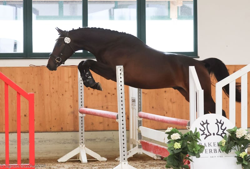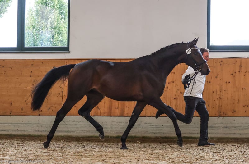 Aristomacho is a 4-year-old Trakehner gelding. He is absolutely well-behaved in handling, eager to learn, very affectionate, and people-oriented. He is easy to manage with other horses and suitable for herd life. Lunging, work on the treadmill, leading, and free jumping are no problem for him. He is already ridden and demonstrates a remarkable willingness to learn and a calm demeanor. Thanks to his excellent basic gaits and outstanding jumping ability, Aristomacho is suitable for all disciplines in equestrian sport. Additional videos available upon request.