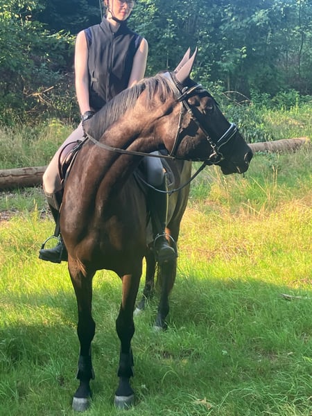 Ganzschwarz – hier ist der Name Programm. Dieser imposante, großrahmige, vierjährige Wallach misst stolze 174 cm und beeindruckt mit seinem tiefschwarzen Fell ganz ohne Abzeichen. Für sein junges Alter zeigt er sich außergewöhnlich brav und unkompliziert. Er ist leicht zu reiten, reagiert fein auf Hilfen und macht bei allem begeistert mit. Ob im Viereck, auf dem Springplatz oder im Gelände – Ganzschwarz ist ein verlässlicher Partner, der sowohl alleine als auch in der Gruppe sicher und gelassen unterwegs ist. Auch landwirtschaftliche Großmaschinen, Hunde, Hühner oder spielende Kinder bringen ihn nicht aus der Ruhe. Im Umgang ist er ebenso angenehm: Er ist verlade- und schmiedefromm, kennt den Tierarzt und zeigt sich auch im Alltag stets freundlich und kooperativ. Ganschwarz ist ein echter Allrounder, der sowohl für den ambitionierten Freizeitreiter als auch für den Einstieg in den leichten Sport geeignet ist. Menschenbezogen, lernwillig und mit einer ruhigen Grundeinstellung ausgestattet, bietet er beste Voraussetzungen für viele gemeinsame Jahre. Er ist regelmäßig geimpft, entwurmt und tierärztlich versorgt. Weitere Informationen zu seiner Ausbildung und seinem Gesundheitszustand sende ich auf Anfrage gerne zu. Besichtigungen und Probereiten sind nach Absprache möglich, der Preis ist verhandelbar. Anfragen bitte nicht per Mail, sondern möglichst per WhatsApp oder telefonisch unter folgender Nummer: +49 160 90213671.