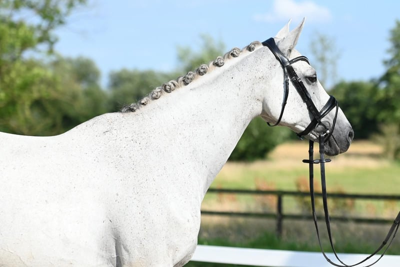 Belle Occasion Go is a wonderful gray mare who embodies a very special breeding value due to her exquisite performance genetics: One of the very few daughters of the Anglo-Arabian Bouquet AA and therefore a granddaughter of the outstanding performance sire Bajar ShA. Her sire personally asserted himself in the advanced level course and produced a large number of sport horses that were highly successful in eventing and jumping competitions up to the highest level. Her maternal line is also characterized by the best blood: Her dam is one of the few daughters of the Acatenango xx son Wörthersee xx, who left the breeding scene far too early. Granddam Belle Etoile Go is by the Mazagran son Rittersporn, who was successful in advanced (S) level courses under Ulrich Meyer zu Bexten. Belle Occasion Go has a wonderful interior, is always calm and friendly and can hardly be ruffled by anything. She proved to be very fertile with us: two promising colts by Sea Lion xx and Belun from the 2023 and 2024 crops are growing up. She was not covered in 2024! Several years ago, she suffered an accident due to external influences, which affected the tendon of her front foot. As a result, she can no longer be used under the rider, but only for breeding. Belle Occasion Go is only being sold for reasons of space; we would like to find her a new, well-cared-for breeding task and new owners who appreciate and correctly recognize her breeding value.