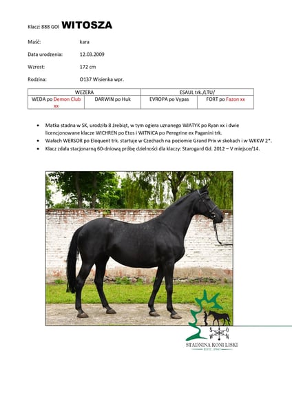 Zuchtstute, Mutter eines anerkannten Hengstes und zweier lizenzierter Stuten. Hoch bewertet für ihren Exterieur. Sie hat die Leistungsprüfung für Stuten bestanden und wurde anschließend in der Zucht eingesetzt, jedoch nie mehr unter dem Reiter geritten. Stute vom Züchter: Gestüt Liski E-Mail: konie.liski@interia.pl