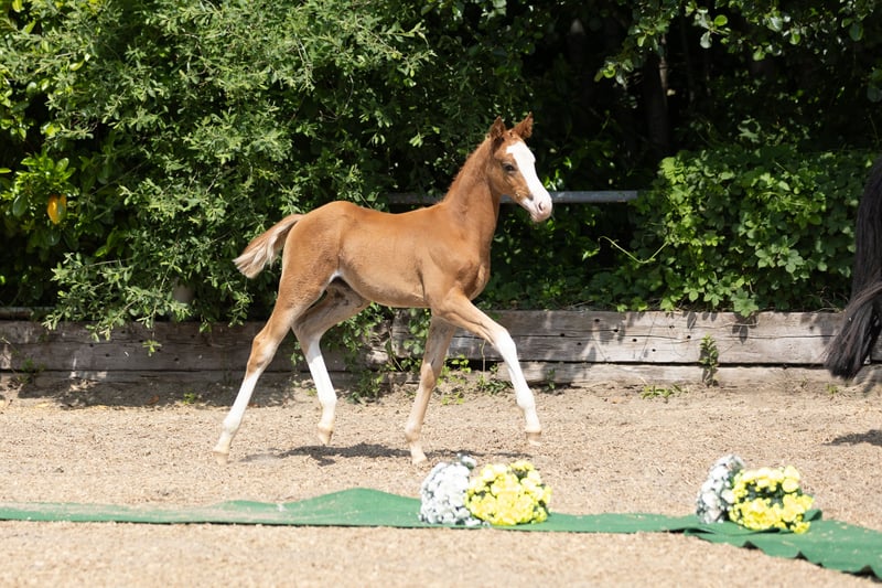 Father Rockingham not only showcases a convincing debut as a sire but also impressed at every start in age-appropriate competition tests - a record crowned by the title of the reigning "Trakehner Dressage Champion" and qualification for the Bundeschampionat of the German Dressage Horse. His daughter appears like a true princess, attractively marked, noble, and feminine, with particularly harmonious body parts. She moves off the spot diligently and energetically, makes herself big while doing so, never loses her rhythm, and captivates with both relaxation and impulsion. The highly awarded mother is one of the few daughters of the S-dressage successful Hancock and represents a top lineage from which numerous breeding and sport elites have emerged in close relation. Breeding and sport are exemplarily combined here. Inquiries are welcome via email at: couralou@t-online.de.
