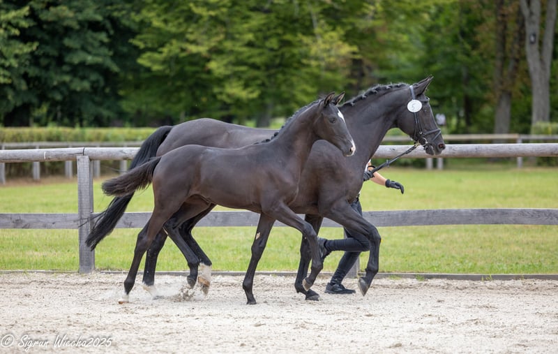 Leggy and noble, feminine and refined, with generously proportioned body parts, this filly by the captivating stallion Hirtenstern (v. Hirtentanz), known for his impressive performances, truly makes a statement. She is gifted with great talent, especially when she moves: always uphill, she displays an impressive dynamic and a sense of grandeur from the very start, remaining steady in rhythm. Calm and balanced in her temperament, her entire demeanor is friendly and trusting towards humans, always eager to give her best. On her dam's side, she also boasts excellent sporting qualities inherited from the performance-oriented stallion Sonnenstrahl. This interesting filly is a true revelation in terms of sporting potential.