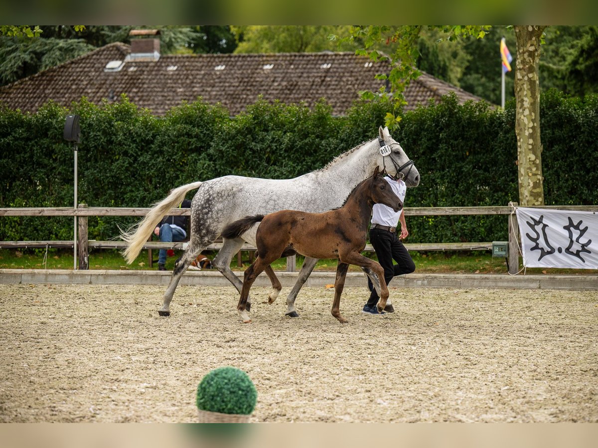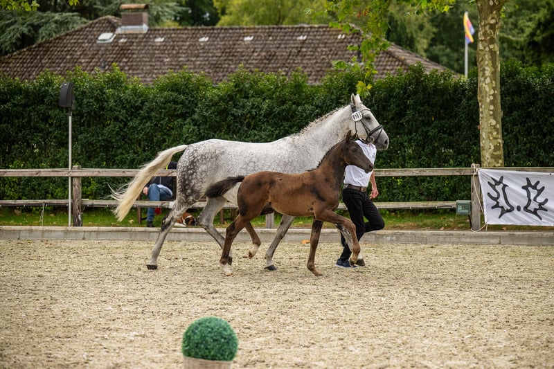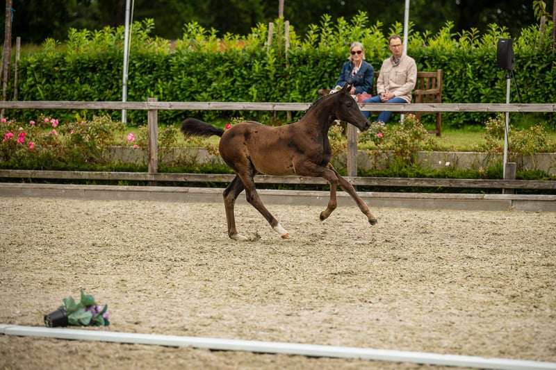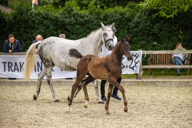 In tänzerischer Leichtigkeit und mit der Selbsterhaltung und dem Bergauf einer typbrillianten Diva kann sich dieses Stutfohlen beständig bei jedem Auftritt in Szene setzen. Der Vater Bahrain avancierte 2023 als bewegungsstarker und charismatischer Halbblüter im Rahmendes Trakehner Hengstmarktes zum Publikumsliebling. Die Mutter Blütenzauber ist eine Tochter des in internationalen VS-Prüfungen sowie ebenfalls in S-Springen erfolgreichen El Greco TSF. Es folgt im fallenden mütterlichen Stamm der erwiesene arabische Leistungsvererber Bazar, dieser ist wiederum ein Sohn des legendären Bajar, der resultierend aus einer bewussten Linienzucht, ein zweites Mal im mütterlichen Pedigree verankert ist. Der Ursprung dieses unter Outcross-Gesichtspunkten züchterisch attraktiven Pedigrees liegt in der bewährten Familie der Bergsicht (Carl - Gut Ludwingsburg). Der Vollbruder zur Ur-Großmutter war unter dem Namen „Balsac“ selbst im internationalen Vielseitigkeitssport erfolgreich. Ein weiterer Halbbruder zur Ur-Großmutter) konnte sich zudem erfolgreich im S-Parcours bewähren. Blutgeprägte Offerte in edlem Erscheinungsbild und besten disziplinübergreifenden Referenzen.