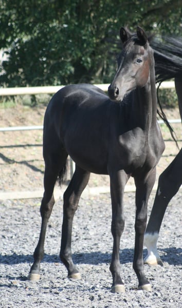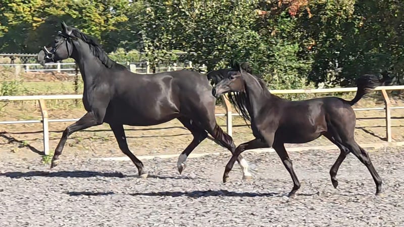 La Barina TN — potra negra de cría, nacida en la primera camada de la campeona de la Prueba de Selección de Trakehner, Barino (línea paterna del Prämienhengst Schwarzgold). La madre del potro, nacido el 17 de marzo de 2025, es la yegua alazana Lamara TN, ganadora de la Prueba de Rendimiento de yeguas de la asociación y de la federación, por el semental de prestigio Goldschmidt (de Biotop – Hohenstein) — Karo As — Marduc. La yegua fue vencedora en su prueba de rendimiento en Hannover. La Barina se presenta como una potra muy tipificada, de buen desarrollo y con un paso enérgico, lo que la hace especialmente apta para la disciplina de doma clásica. Además, su genética muestra una fuerte presencia de sangre de doma, incluyendo linajes como Biotop, Hohenstein, Imperio, Marduc y Mahagoni. Por ello, también sería una yegua de cría de gran interés, recomendada por la dirección de la cabaña, especialmente en la actualidad, donde puede considerarse casi como un cruce de líneas. La Barina TN fue galardonada con la máxima prima de cría posible.