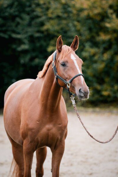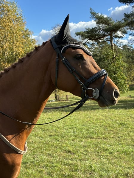 Isabella is a stunning, lively, and characterful young mare. Descended from the premium stallion Banderas, who consistently impresses with high-quality offspring, and out of a Brioni mare (Brioni was the winner of the Nurmi Versatility Testing and placed in show jumping, dressage, and eventing competitions), her Arabian influence is immediately noticeable. She features an elegant head with large, friendly eyes, dry and clear joints, sufficiently large and strong hooves, and a small yet compact body. In her temperament, she is very human-oriented and, although sometimes a bit stubborn, she is always easy to handle and work with. She was backed this spring and shows potential across all disciplines. Due to her calmness, we see her excelling in eventing. Recently, she made a good impression at the eventing screening organized by the Trakehner Verband. Given her age and training level, Isabella is not suitable for insecure riders, beginners, or re-entrants. She is in excellent health, fully vaccinated, regularly shod, and easy to handle. She loads into the trailer like a pro! X-rays can be taken upon request at the buyer's expense. For more information, please contact me or her trainer, Laura Schmager.