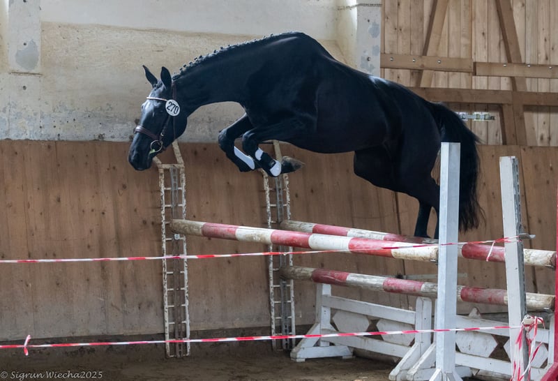 Eine besondere und vielversprechende Offerte ist diese 3jährige Tochter, des zweimaligen Vizebundeschampions in der Vielseitigkeit Sturmpfeil. Die im passioniertem Züchterstall geborene und aufgewachsene Stute überzeugt mit blutgeprägtem Erscheinungsbild und einem ansprechendem Bewegungsablauf in den drei Grundgangarten. Insbesondere im Freispringen weiß sie mit viel Übersicht, einer guten Manier am Sprung sowie Vermögen zu überzeugen. Dies wurde u.a. im Rahmen der Stuteneintragung mit der Note 8 in Manier und Vermögen honoriert. Die auffällige Stute mit dem Namen Emilie Elbzauber ist eine Ware genetische Rarität ist Sie doch eine der wenigen Töchter des VS-Asses Sturmpfeil, der nach seinen Erfolgen beim Bundeschampionat mittlerweile auch altersgemäße internationale Erfolge aufweisen kann. Im fallenden mütterlichen Stamm dieser talentierten Nachwuchshoffnung folgt im Pedigree der ebenfalls Springveranlagte Scheckhengst Sheridan. Das besondere wie exklusive Leistungspedigree dieser 3-jährigen Stute lässt auf eine ansprechende Karriere im Vielseitigkeitssport hoffen. Bereits im Rahmen der Stutenleistungsprüfung unter dem Sattel erprobt.