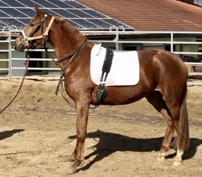 Hailey is a stunning, noble chestnut mare. In May/June 2024, she was lunged and introduced to the saddle and rider. Afterwards, she spent another year in the stable and on the pasture, as she was born late in the season. From July 2025, she was backed and started under saddle with the Bavarian Breeding Association in Munich-Riem. Impressions from the foreign rider test during her mare performance test (after 7 weeks of training!). See video! Performance test evaluations include: Character 10.0; Temperament 9.0; Willingness to perform 9.5; Conformation 9.0 Hailey is rideable (and comfortable to sit), friendly, and well-behaved. Health condition = top fit. X-ray images from August 26, 2025: no findings! Hailey’s pedigree: Sire: P.H. Karim Dorè (see attached picture – chestnut stallion) On her sire’s side, she descends from the Grand Prix dressage horses E.H. Imperio and E.H. Insterburg – the highest-rated Trakehner “Star” sires of 2025, ranked 1st and 2nd. Dam: St.Pr. and Pr.St. Hetidze v.H. (see attached picture – Rapp mare) On her dam’s side, the Trakehner stallions E.H. Monteverdi and Ibikus guarantee excellent riding horse qualities. Hailey’s very good general impression (see video at the longe line) continues to be developed – now under the rider. Hailey can be tested under saddle at any time. For inquiries and to arrange a viewing, please contact her rider and trainer, Kathrin Reisinger, at: +49 173 2732008.