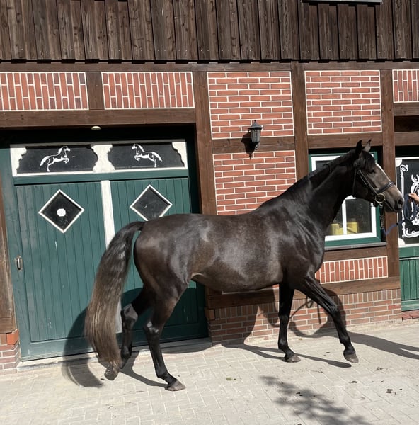 This young mare combines dressage potential, versatility talent, and an excellent pedigree. Clear in her mind, strong in her movement - a true prospect for sport and breeding. She is ready for her role as a riding horse, absolutely cool and affectionate, she will become a great partner for sport, leisure, and breeding. She has already started with light work. Her father passes on his traits decisively, alongside top character, very good rideability, and nerve strength, of course, also very good gaits and jumping ability. Her mother is a premium mare with racing performance and produced her first foal, which was immediately awarded. Two other full siblings have been awarded the highest premium of their year. Thus, she is also a highly interesting future breeding mare!