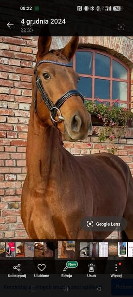 Klacz 6 letnia, zdrowa, jezdna, mądra. Bardzo urodziwa. Ma bardzo dobry papier. Nadaje się do wysokiego sportu. Nadaje się do hodowli. Pracuje z siodła i ziemi. Zadbana. Suplementowana i dobrze odżywiona. Lubi kontakt z innymi końmi