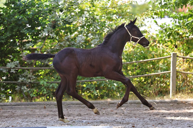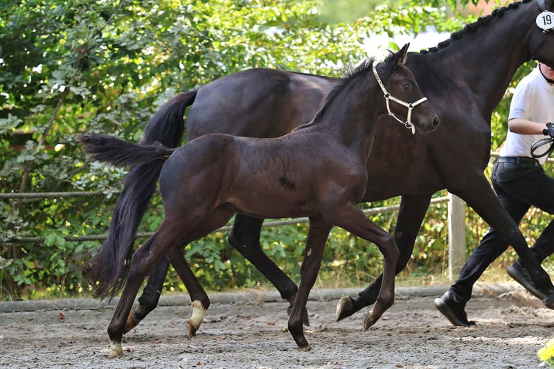 Mit dem Überguss des Besonderen verkörpert diese Schwarzgold-Tochter schon beim ersten Eindruck eine verzaubernde Aura, die untermalt wird mit allen Attributen der klassischen Trakehner Machart im modernen Gewand. Adel ergänzt sich mit Format, Schönheit mit Qualität und die äußere Erscheinung bestätigt das züchterische Glück der sehr gut durchdachten Konstellation des Pedigrees. Von den sieben Vererbern der ersten drei Generationen sind alle mit dem Elite - Titel geehrt worden und fünf waren bis zur Dressurklasse S und höher im Sport erfolgreich. Auf der Basis einer der erfolgreichsten Stutenfamilien der Gegenwart erscheint dieses im Typ so unverfälschte und bewegungsstarke Stutfohlen mit komfortablen Rahmen wie ein Geschenk für die züchterische und sportliche Zukunft.