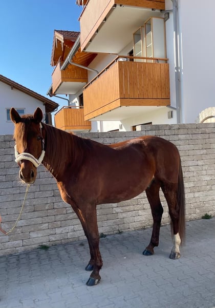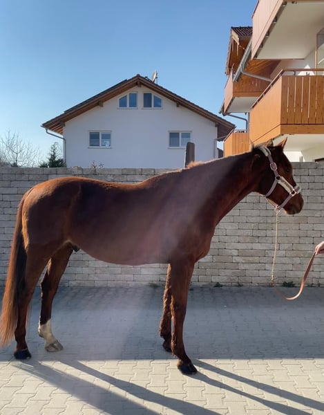 Wunderschöner Traber Fuchs Wallach mit sehr guten liebevollen Charakter sucht seinen Freizeitpartner, der gerne mit ihm fahren und reiten möchte. Lucador ist zurzeit viel im Gelände unterwegs, geht auch schon schön auf dem Viereck, muss aber noch gefördert werden. Kennt alle drei Grundgangarten. Im Gelände geht er alleine und in der Gruppe, er ist im Gelände sehr unerschrocken. Steht derzeit Tags auf der Koppel, nachts in der Box, kennt Offenstall aber auch. Wir suchen einen Partner für Lucador, der ihm weiterhin die Ausbildung bietet, das heißt kein Anfänger. Er ist ein wahrer Schatz, mit dem man durch dick und dünn gehen kann, weil er an allem großes Interesse zeigt. Lucador ist kerngesund. Ist aus dem Sport gegangen, weil er in Deutschland keine Rennen mehr hat. Ist auf allen vieren beschlagen, gechipt, geimpft und entwurmt. Keine Händler und Reitschulen. Fürs Probereiten werden 30€ verlangt.