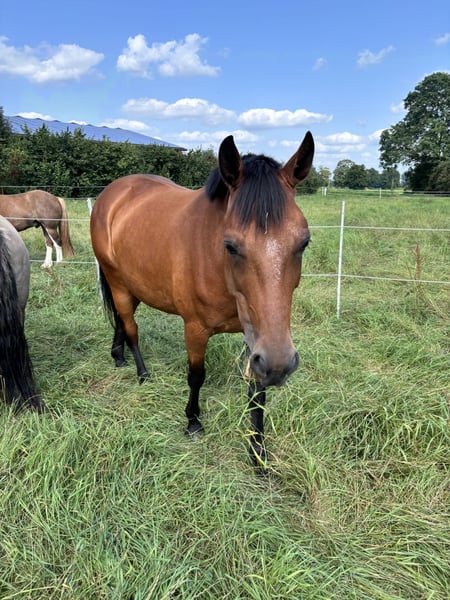 Hallo du! ich bin Enjo – ein 9-jähriger Traber-Wallach – 1,63m groß und ich suche meinen Herzensmenschen. Vielleicht ja genau dich? Auch wenn ich ein Traber bin, bin ich nie Trabrennen gegangen. Die Rennbahn ist also nichts für mich – und ehrlich gesagt habe ich daran auch gar kein Interesse. Viel lieber bin ich gemütlich unterwegs, genieße die Natur und erkunde als Freizeit- und Geländepferd die Welt. Genau dort fühle ich mich am wohlsten – im Wald, auf Feldwegen und bei entspannten Ausritten. Mit meinen 9 Jahren bin ich im besten Alter: kein Fohlen mehr, aber voller Energie für viele gemeinsame Jahre. Ich bin freundlich, ehrlich und wünsche mir einen Menschen, der Lust auf eine partnerschaftliche Zusammenarbeit hat. Ein kleines Extra bringe ich auch mit: Ich habe eine Hernie, die mich im Alltag nicht stört oder einschränkt. Allerdings bin ich dadurch kein Springpferd – hohe Hindernisse sind einfach nicht mein Ding. Dafür begleite ich dich zuverlässig im Freizeitbereich. Außerdem habe ich ein bisschen Magenprobleme. Deshalb vertrage ich nur Heu und keine Heulage. Für mich wäre es ideal, wenn ich 24/7 Zugang zu Heu hätte, damit mein Magen glücklich bleibt. Ein Offenstall wäre ein Traum für mich – alternativ wäre auch tagsüber Weidegang und abends eine Box möglich. Hauptsache, ich darf viel draußen sein und regelmäßig Heu knabbern. Im Galopp fällt es mir noch etwas schwer – da brauche ich einen geduldigen Menschen, der mir Zeit gibt und mich liebevoll unterstützt. Mit Ruhe und Vertrauen lerne ich aber gerne dazu und gebe mir große Mühe. Vorne trage ich Eisen, weil ich dort etwas fühlig bin. Damit komme ich aber gut zurecht und bin so angenehm zu reiten. Aktuell stehe ich in 49163 Bohmte und kann dort nach Absprache gerne kennengelernt werden. Ich freue mich, wenn du vorbeikommst und wir schauen, ob die Chemie zwischen uns stimmt. Und das Wichtigste zum Schluss: Platz vor Preis. Mein neues Zuhause soll wirklich passen – liebevolle Hände, Geduld und ein schönes Umfeld sind wichtiger als alles andere. Wenn du also ein treues Freizeitpferd suchst, das mit dir entspannt durchs Gelände zieht und mit dir gemeinsam wachsen möchte, dann könnte ich genau dein Enjo sein. Ich freue mich auf dich!