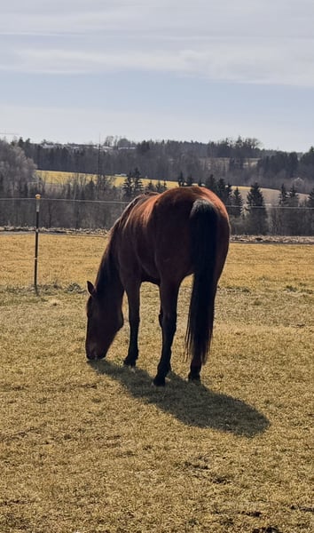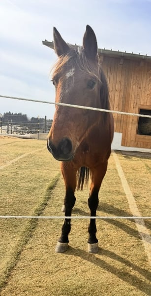 Our Giny is looking for a wonderful new home. She competed successfully in harness racing until 2024. Afterwards, she was lightly ridden in the leisure sector in the three GGA disciplines. She came to us as a companion horse to keep company for our mare and has enjoyed life on the pasture for the past six months. We are offering Giny for sale due to herd reduction. She is in excellent health, fully vaccinated, dewormed, and has an up-to-date dental check. She is barefoot. Her temperament: affectionate, sweet, and curious. My 10-year-old son has always taken care of her. She is familiar with both stable and open stall management. In the herd, she is low-ranking to middle-ranking and always friendly towards the other horses.