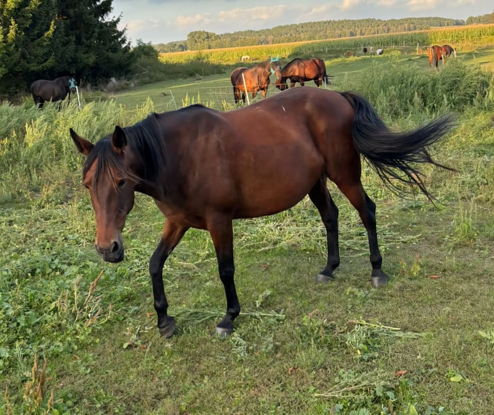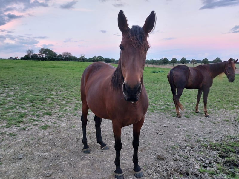 Drachtige merrie, 11 jaar, bruin, ca. 1,60 m stokmaat Ideaal als recreatiepaard of voor de fokkerij Helaas heeft ze haar ideale eigenaar nog niet gevonden. Ze blijft steken in haar merrie-gedrag, daarom is ze niet geschikt voor beginners. Ze is geschikt voor mensen die graag en veel grondwerk willen doen: horsemanship, equikinetic, enzovoort. Ze is bereden geweest, maar dat ligt al enige tijd achter haar. In de afgelopen jaren heeft ze twee veulens gekregen, die allebei in mijn bezit zijn. Ze staat 24/7 in een open paddock. Shoeing, dierenarts en transport vormen geen probleem. Afstamming voor fokkers: Here Comes Joey a.d. Rocca Nooit gelopen in de race, maar wel getraind en talentvol. Bij vragen, neem gerust contact op. Locatie: 39539 Havelberg Vraagprijs: €2500 Onderhandelbaar