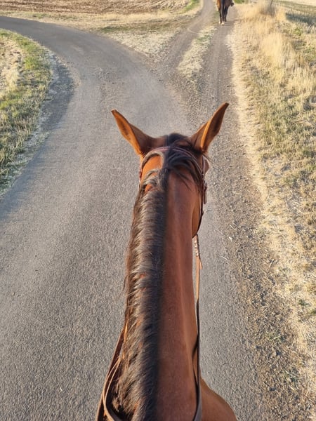 I am looking for a new home for my 17-year-old Standardbred mare. Unfortunately, we haven't quite found our rhythm together. I originally purchased her as a companion horse after the passing of my other mare, and I started riding her afterwards. Inside the arena or on the riding surface, she moves well in walk and trot under saddle. She is also very responsive on the double lunge line, and we have begun some canter work. Out in the field, she is fearless and calm. She is manageable in all three gaits both ridden and in hand. I can easily envision her as a leisure partner for someone who enjoys and frequently rides out in the countryside, possibly also suitable for orienteering rides. She is currently fully shod. Unfortunately, she suffers from recurrent conjunctivitis, but this does not affect her otherwise. Her eye appears cloudy, but this comes and goes and does not cause her any pain. Definitely, space takes priority over price! Please feel free to contact me anytime if you are genuinely interested or have questions.