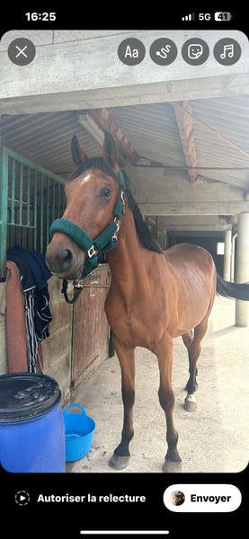Léopard de l'Isop ist ein freundlicher 4-jähriger Wallach. Er ist etwa 1,72 m groß. Er ist ein französischer Trabrennpferd, das noch nie im Rennen gelaufen ist. Er ist nicht für Anfänger geeignet. Er muss noch ausgebildet werden, kennt das Galoppieren noch nicht. Ein gutes Dressur-3-4-Training ist erforderlich. Er wird nur in eine Familie mit Haushaltung aufgenommen. Er ist barhuf, war nie im Stall, sondern das ganze Jahr über nur auf der Weide. Dies ist ein Pferd mit viel Energie, das beim Aufsteigen ein wenig unruhig ist, aber nichts Schlimmes – am Boden bleibt er ruhig. Er hat ein kleines, liebenswertes Gesicht. Er ist im Training noch unerfahren, kennt die Reitbahn und vor allem die Außenbereiche, da wir viel Zeit draußen verbracht haben. Er hat bereits einige Sprünge gemacht. Dieses Pferd ist sehr liebenswert, und ich verkaufe es schweren Herzens. Er kann sich sehr schnell beruhigen, wenn er Angst hat. Anfangs fällt es ihm schwer, sich zu konzentrieren, aber sobald er aufmerksam ist, ist er ein echter Schatz. Er denkt viel an seinen Besitzer und sollte mit Artgenossen zusammenleben. Er versteht sich sehr gut mit den anderen Pferden, ist aber nicht dominant. Liebenswert, freundlich, anhänglich, aufmerksam und energisch – dieses Pferd ist ein echtes Herz. Er wird mit seinem Granulat (25-kg-Sack und etwas mehr als die Hälfte eines Sacks), seinem Sattel, seinem Gebiss und seiner Decke abgegeben. Gesundheitlich gibt es keine Probleme. Besichtigung in Isère möglich. Preis: 3.600 €
