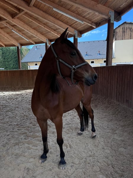 Sky is a small, delicate trotter who has been with us since he was a foal and has never been on the racetrack. He was gently backed at the age of 4 by Martin Wimmer using Parelli methods. He is familiar with groundwork, trail riding, and work in the arena. He is very fearless and always eager to please. Due to his size, he is ideal for gentle ladies or young people and is not a weight carrier. Recently, he hasn’t been worked much due to a lack of time, so he is still fresh. He is accustomed to both open stable and box housing; he currently stands in an open stable and is in a mixed herd, being very social and uncomplicated. He has always been barefoot and has never needed shoes. He is also familiar with loading and is very well-behaved, stepping in without hesitation. A horse with which you can do anything and who is always up for fun (see videos).