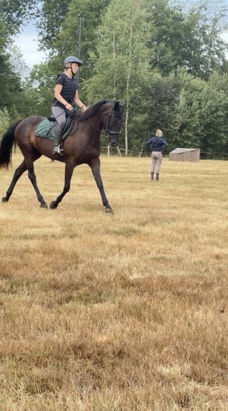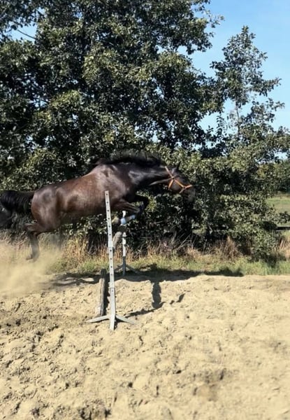 Dit is J’adore, een super brave merrie van 6 jaar. Ik heb haar volledig zelf opgeleerd wat super gemakkelijk ging. Ze is een super aangenaam wandelpaardje en de basis dressuur heeft ze ook onder de knie. Ze kent stap, draf, galop en loopt ook al vrij mooi nagefelijk. Alleen of in groep, lukt beide ook op drukkere wegen. Ook bitloos op wandeling of in de piste is ze het perfecte paardje. Ik heb er zelf al zonder zadel én bitloos op gereden! Super kindvriendelijk en sociaal op de grond. Ze is gewoon om 24/7 buiten te staan met schuilstal in een grote kudde en is totaal niet dominant tegenover de andere paarden. Tijdens het vrijspringen heeft ze al ongeveer 105 cm gesprongen. Kortom een ideaal recreatiepaardje om samen mee te groeien en ontspannende ritjes mee te maken. Heb jij interesse in deze prachtige merrie? Stuur dan zeker een privébericht voor meer info