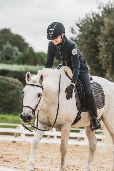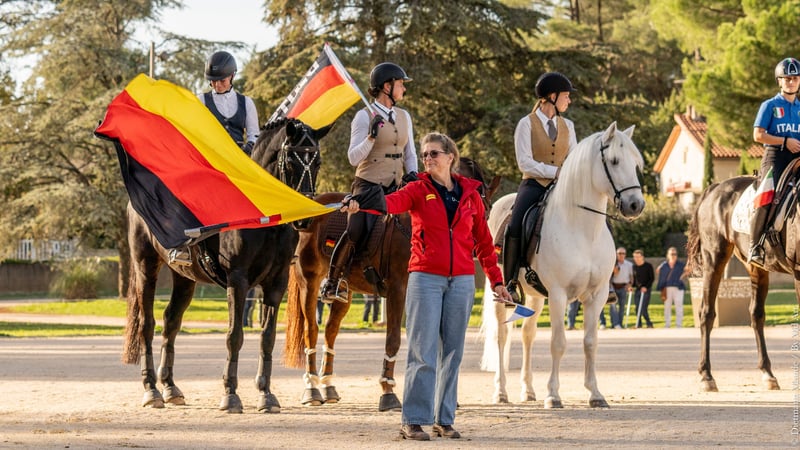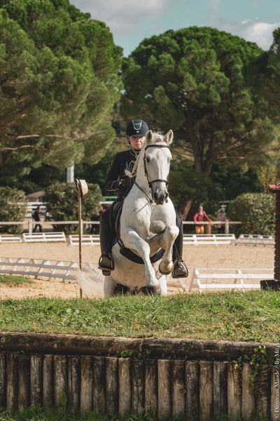 Barockes Mähnenwunder Voyou ist ein sehr dominanter Bursche, der sich dennoch seinem Weidepartner Wallach genügsam unterordnet. Der klügere hat seine Ruhe. Er ist ein sehr fleißiger engagierter und häufig laut kommunizierender Kerl. Sein Nachwuchs ist mit einer Mördermähne ausgestattet, die er von seiner Mutter über Tanpis du Mas geerbt hat. Die Ausbildung des Pferdes macht unglaublich Freude, weil er sehr konkret reagiert und feinfühlig ist. Voyou ist fürs Turnier bis zur Masterclass ausgebildet, packt Geländehindernisse wie Trailhindernisse völlig unbeeindruckt an. Er arbeitet in der Dressur sowohl bei den fliegenden Wechseln als auch in der Piaffe energisch mit. Beim Ausritt läßt er gern mal camarguetypisch so richtig Tempo heraus, ist aber jederzeit herunter zu regulieren. Seine herausragenden Qualitäten hat er bei der FITE EM 2024 zeigen können, bei der er eine Bronze-Medaille errang. Auch an den Rindern wird dieses Pferd gearbeitet. Wir erhalten damit die Ursprünglichkeit der Rasse und testen nicht nur ihren Will-to-please als Arbeitspferd, sondern auch ihre Rindertauglichkeit.