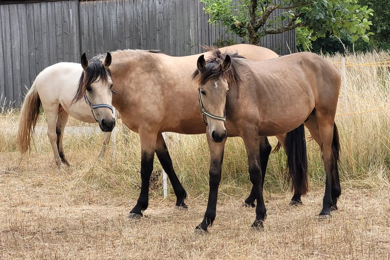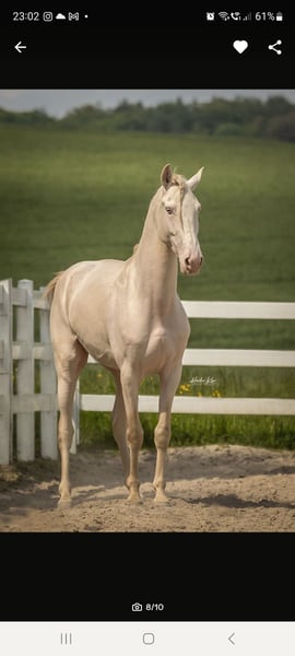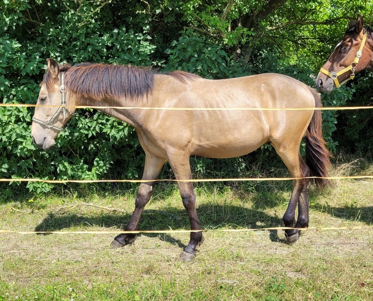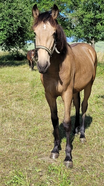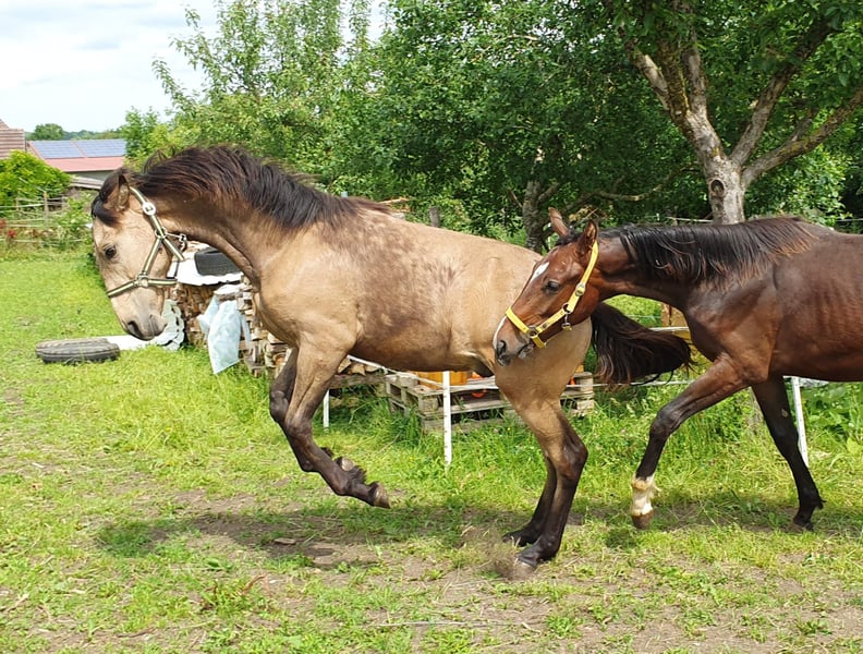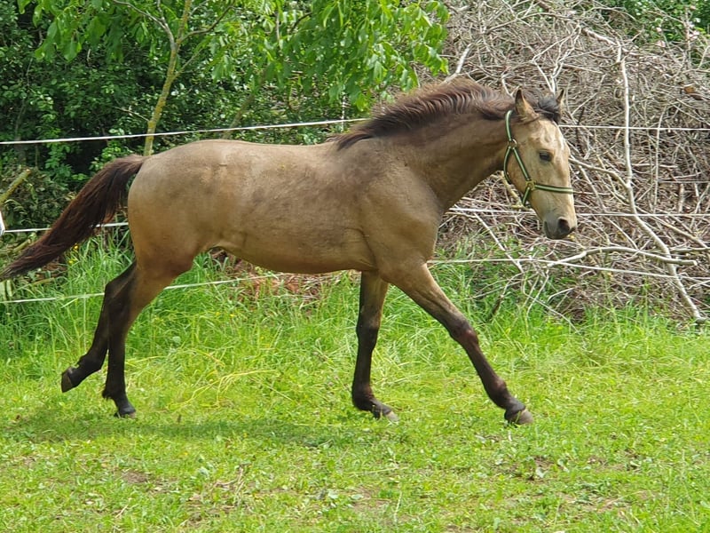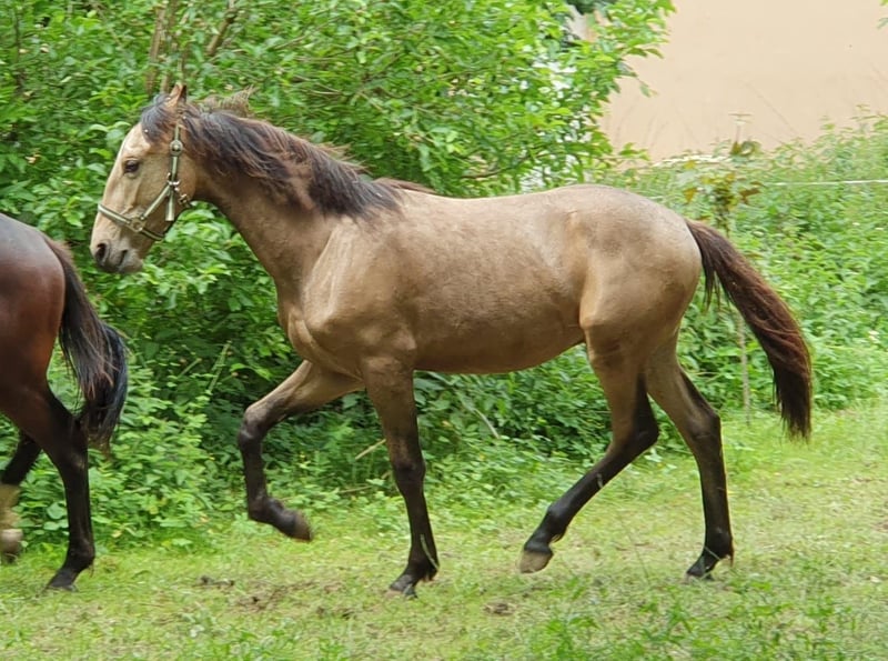 Einmalige Gelegenheit für Jemanden der das Besondere sucht: Unser wunderschöner Buckskin Warlander Jährlings-Hengst "Mephisto von Greenhorn" mit Papieren vom BZVKS und eingetragen beim internationalen WSS ist wegen Bestandsverkleinerung in gute Hände abzugeben. Bevorzugt in künftige Hengsthaltung mit Zuchtambition, ist aber kein absolutes Muss. Solange er ein gutes Zuhause bekommt, könnten wir auch damit leben, wenn er irgendwann zum Wallach "degradiert" würde. War bei Eintragung Prämienfohlen. Vater: Lusitano APSL (Perlino), die beiden vorletzten Bilder. Mutter: Friese KFPS (vor Ort zu besichtigen), die beiden letzten Bilder. Halbschwester mütterlicherseits (vor Ort) zum Vergleich, 3jährig, drittes Bild. Wird ca 162- 166 cm EM und steht eher im sportlichen Typ. Beide Eltern sind angenehm weich zu sitzen, also wird er es mit Sicherheit auch sein. Mephisto ist gut sozialisiert aufgewachsen in einer gemischten Herde, steht mit einem älteren Wallach, einem gleichaltrigen Jährlingshengst und tragenden Stuten zusammen. Er ist Robusthaltung gewohnt, ganzjährig Offenstall und Weide. Sehr verschmust, menschenbezogen und überhaupt nicht hengstig. Regelmäßig entwurmt und geimpft. Anständig beim Hufschmied. Artig im Umgang (Führen, Anbinden, Putzen, Verladen). Seine umfangreiche Farbgenetik (ggEeAaCrcr) macht ihn für die Zucht extrem interessant, denn er kann theoretisch alle Farben vererben (Buckskin, Brauner, Perlino, Palomino, Fuchs, Cremello, Smoky Black, Rappe, Smoky Cream). Schimmel sind nur möglich, wenn die Stute Schimmel ist, er selbst trägt kein Grey. Farbwechsler - im Winter sehr dunkel, im Sommer schön hell (siehe Bilder) Nachkommen würden Warlander Papiere aus folgenden Stuten erhalten: Warlander, Friese, PRE, Lusitano, PRM, Cruzado Iberco (Lusi x PRE). Friese-Iberer(PRE/Lusitano)-Mixe gibt es einige, aber die gezielte und durchdachte Kreuzung mit Warlander Papieren ist noch immer sehr selten - und noch seltener im Verkauf zu finden, ganz besonders in dieser traumhaften Sonderfarbe Buckskin. Bitte ausschließlich ernstgemeinte Anfragen. Wir legen großen Wert auf weiteren Kontakt auch nach der Abgabe, möchten seine Entwicklung und Werdegang gerne mitverfolgen. Mephisto kann jederzeit in sein neues 5-Szerne Zuhause ziehen.