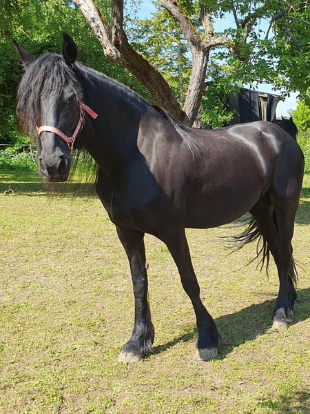 Unieke kans voor iemand die het bijzondere zoekt: Onze prachtige Buckskin Warlander hengstveulen "Mephisto van Greenhorn" met papieren van het BZVKS en geregistreerd bij de internationale WSS wordt wegens het verkleinen van de stal in goede handen aangeboden. Bij voorkeur voor toekomstige hengstenhouderij met fokambitie, maar dit is geen absolute vereiste. Zolang hij een goed thuis krijgt, kunnen we ook leven met het idee dat hij op een dag "gedegradeerd" zou worden tot ruin. Was bij inschrijving een premium veulen. Vader: Lusitano APSL (Perlino), de voorlaatste twee foto's. Moeder: Fries KFPS (ter plaatse te bezichtigen), de laatste twee foto's. Halfsister van moederszijde (ter plaatse) ter vergelijking, 3 jaar oud, derde foto. Wordt ongeveer 162-166 cm schofthoogte en heeft een sportief type. Beide ouders zijn aangenaam zacht om te zitten, dus hij zal dat zeker ook zijn. Mephisto is goed gesocialiseerd opgegroeid in een gemengde kudde, staat samen met een oudere ruin, een gelijkwaardige hengstveulen en drachtige merries. Hij is gewend aan robuuste huisvesting, het hele jaar door in een open stal en op de wei. Zeer aanhankelijk, mensgericht en helemaal niet hengstig. Regelmatig ontwormd en gevaccineerd. Netjes bij de hoefsmid. Braaf in de omgang (leiden, vastbinden, poetsen, laden). Zijn uitgebreide kleurgenetica (ggEeAaCrcr) maakt hem extreem interessant voor de fokkerij, want hij kan theoretisch alle kleuren vererven (Buckskin, Bruin, Perlino, Palomino, Vos, Cremello, Smoky Black, Zwart, Smoky Cream). Schimmels zijn alleen mogelijk als de merrie schimmel is, hij zelf draagt geen Grey. Kleurwisselaar - in de winter zeer donker, in de zomer mooi licht (zie foto's). Nakomelingen zouden Warlander-papieren ontvangen van de volgende merries: Warlander, Fries, PRE, Lusitano, PRM, Cruzado Iberco (Lusi x PRE). Fries-Iberische (PRE/Lusitano) mixes zijn er enkele, maar de gerichte en doordachte kruising met Warlander-papieren is nog steeds zeer zeldzaam - en nog zeldzamer te koop, vooral in deze droomachtige speciale kleur Buckskin. Gelieve uitsluitend serieuze aanvragen te doen. Wij hechten veel waarde aan verder contact ook na de overdracht, willen zijn ontwikkeling en loopbaan graag blijven volgen. Mephisto kan op elk moment naar zijn nieuwe 5-sterren thuis verhuizen.