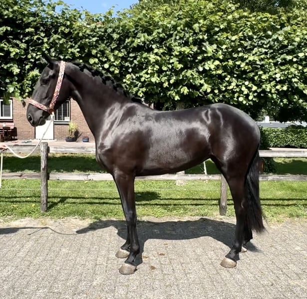 Beautiful 4-year-old PRE x Frisian mare She is 16.0 hands tall, with a lot of substance and will certainly grow a bit more. Libby enjoys extra movement and has three very good gaits. Aside from some lunging, she is still green and completely untrained. She is in possession of a passport.