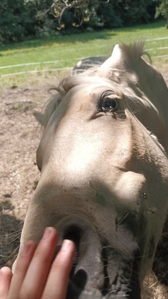 Unser Ponywallach Herkules in wunderschöner Palomino-Farbe wurde am 16.04.2024 geboren und ist aktuell ca. 120 cm groß. Er besitzt selbstverständlich auch einen Pass. Er ist ein total lieber, neugieriger kleiner Kerl, der super gerne Neues lernt – manchmal etwas stur, aber immer freundlich und ehrlich. Er steht im Offenstall und lebt dort in einer gemischten Herde mit insgesamt fünf Pferden. Das Zusammenleben klappt problemlos, er ist sozialverträglich und gut integriert. Er kennt das Führen, Putzen, Hufe geben und erste Übungen an der Longe. Spazieren klappt ebenfalls wunderbar, er läuft entspannt und zuverlässig mit. Lässt sich überall anfassen und liebt es, wenn man ihn am Hals krault. ;) Ein echter Hingucker mit Herz, der sich in liebevollen Händen sicher zu einem tollen Pony entwickeln wird.