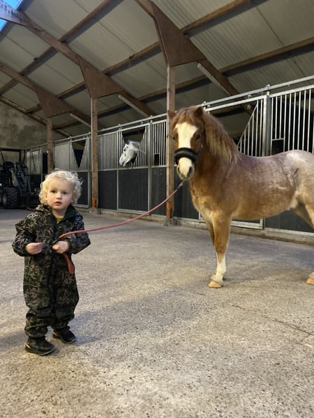 Dieser Welsh-Pony ist wirklich ein beeindruckender Anblick. Im Umgang ist er ein sehr liebevolles und ehrliches Pony, das Aufmerksamkeit und Spielen sehr mag. Auch beim Waschen ist er brav, beißt und schlägt absolut nicht und lässt sich problemlos scheren. Bodenarbeit und Longieren kennt er mittlerweile gut und macht diese zuverlässig. Er scheut keine Hindernisse und geht überall problemlos drüber oder springt darüber hinweg. Er ist jedoch noch nicht sattlebar. Ab und zu hat ein kleines Kind auf ihm gesessen, allerdings wurde er vorher immer longiert und wir halten ihn dabei fest. Für ein Kind sollte er also zunächst noch eingeritten werden.