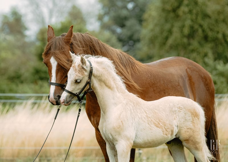 Limetto is an exceptionally typy colt with outstanding Welsh B conformation, correctly built and with convincing movements. In a palomino color with a blaze and four white legs, he is truly a dream. He presents himself as very polite, people-oriented, and open to new experiences. From a breeding perspective, this fine gentleman is something very special, as he brings together the best Welsh B blood: - The dam comes from the legendary show jumper Stars Spirit, who was awarded the Overseas Medal for his quality and scores at the HLP, and has numerous licensed sons and premium mares, including in the riding pony sector. "Spirit Ponies" can be found all over Germany, impressing across the board. - Breeton Dai is one of the most significant stallions in the UK, Germany, and the Netherlands, influencing the breeding of internationally successful Welsh B ponies. - The sire Woldbergs Leonardi produces highly successful riding and driving horses, also in the riding pony breeding. He is a federal reserve champion and FN federal premium stallion, Weser-Ems champion stallion, and HLP reserve champion, showcasing the best Boston Bonaparte blood. To date, four sons have been licensed in Germany. Abroad, there are 16 sons, including the Wales Borders Champion Cadlanvalley Royal Keeper, who is actively breeding. As this stallion is so impressive, we already have several Leonardi offspring that are known as brave and level-headed children's ponies and are in harness. Limetto is growing up alongside his half-brother, frolicking and playing in the open stable and on the pasture. The experienced broodmares provide the necessary socialization. He is regularly dewormed and provided with the best foal feed. He knows the foal ABC, walks well on a halter, and is familiar with giving hooves and being tied. In our daily operations, he learns everything a future children's and driving pony should know. He received the foal premium with excellent judges' remarks and scored 3x 9.0 for type, 3x 9.0 for conformation, and 3x 8.0 for movement at the foal championship. A pony with all doors open, eager to explore the world with a family! He could move to a new home starting in October. We are looking for (Welsh) pony-experienced individuals or breeders who are knowledgeable about the upbringing and training of young horses or who will be supported in this task by experienced individuals. We would be happy to discuss everything further by phone and on-site and look forward to your inquiry! We do not offer a raising facility on-site.