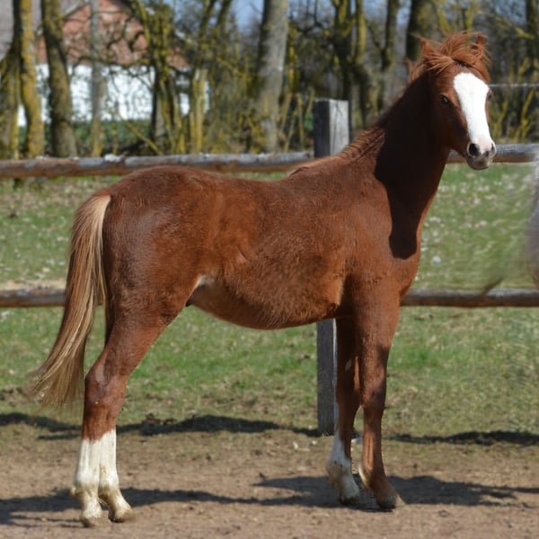 Kienbergs Chester C est un poulain Welsh B très typé, de la couleur de rêve Palomino Roan. En raison d’acheteurs peu fiables, cette perle pleine de caractère cherche malheureusement une nouvelle famille. Ses deux parents sont montés, de grande taille (la mère environ 1,35 m, le père, étalon inscrit, mesurant plus de 1,40 m) et issus de notre élevage. Chester a été élevé selon son âge et est actuellement en compagnie d’un poulain bai, Cadlanvalley Deluxe x Breeton Toy, qui recherche également un nouveau foyer. Les deux jeunes ont été primés à leur foalhood, ils sont vraiment magnifiques et attendent avec impatience la visite de leurs amis poneys.