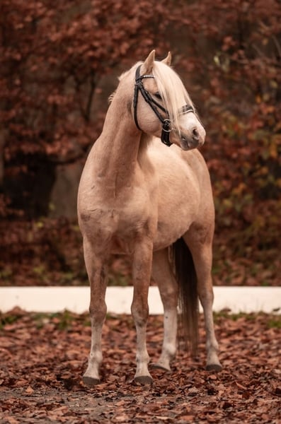 Our beautiful Dancer came to us as a foal and has grown up in a healthy, age-appropriate manner alongside other young horses and stallions. He is lunged regularly, is familiar with free jumping, and is very traffic-safe thanks to walks outdoors. He is extremely well-behaved in handling. He is stabled next to mares and, from autumn through winter, shares the paddock with other stallions and young horses. He already knows the rider’s weight on the longe line and has shown himself to be very calm and gentle from the first attempt at this task. Dancer was licensed in 2025 by the Mecklenburg-Vorpommern Verband. He was intended for our riding pony breeding program, mainly to cover larger mares by hand, but this proved to be difficult for him. Due to safety concerns, I prefer not to pursue outside breeding tips, so he is currently available without a specific order. He successfully covered a mare that is 1.43 m tall, and he was very friendly during the breeding process, both on the hand and with the mare. We are selling him with a heavy heart, either as a stallion or, alternatively, after castration, to train him as a children's pony. There are several photos, including some from his colt years. The picture with the bells is the most recent—since then, he has gained a bit more weight and looks even more robust now. Serious inquiries are welcome to arrange a meeting.