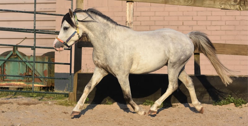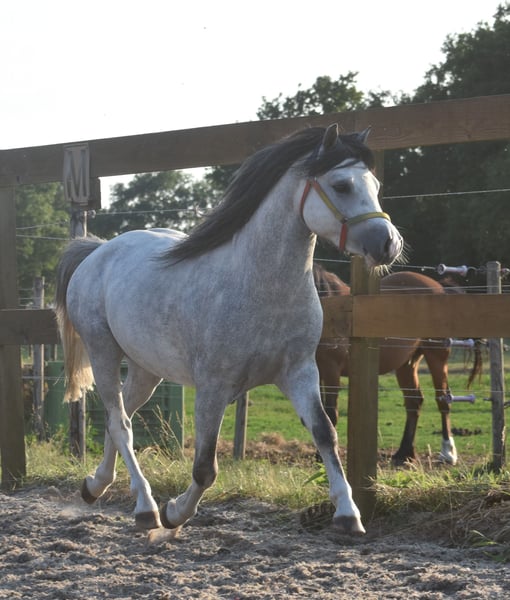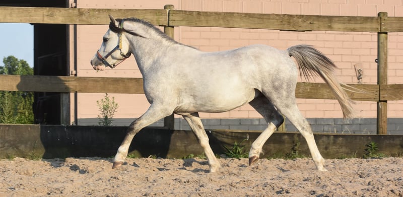 Cuppers Winston ist der Name dieses fast vierjährigen Hengsts! Sein Rufname ist Blue Boy. Er trägt eine wunderschöne, blaue Apfelschimmel-Farbe. Er besitzt eine fantastische, beeindruckende Abstammung: Hier klicken für seine Papiere: Eindegooi’s Pretty Charmer x #Oldenzijlster Action Man x #Vechtzicht’s Cymro Bach. Er hat eine prächtige, vollgebaute und dennoch elegante Konstitution. Ein Kopf, der direkt aus einem Disney-Film stammen könnte. Und sein Gangwerk ist spektakulär! Mit Blue Boy wurde bereits viel Bodenarbeit gemacht, und er ist sowohl hier als auch zuvor stets superbrav im Umgang, in der Trailer, auf dem Paddock und in der Weide. Winston ist momentan ein Wallach, aber als Hengst war er bereits äußerst brav. Er wächst nun in die Höhe und ist eine große B-Maße. Er ist ein unglaublich kooperativer, superlieber Wallach. Er findet das Reiten sehr angenehm und möchte gerne weiter wachsen: Für die Freizeitreiterei ist er hier bereits brav genug, aber auch als Sportpony ist er bestens geeignet. Wir erwarten, dass er sehr leicht zu erlernen ist, zum Kutschieren – das wird bestimmt ein wunderschönes Bild! Er liebt das Reiten sehr und ist von Anfang an brav mit dabei gewesen; wir konnten sofort ohne Probleme auf ihn aufsteigen. Preis: 4.750 € inklusive Marken-Sattel und Abschwitzdecke