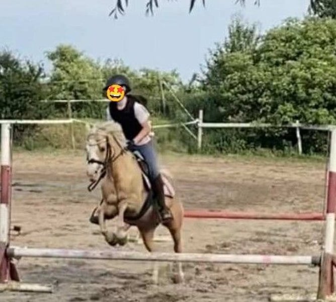 Poney de sport expérimenté de 10 ans, section B - jument Welsh pony Cette adorable ponette de couleur PALOMINO est prête à gagner ! Expérimentée dans les compétitions de saut d'obstacles mini LL pour les enfants. Elle est complètement saine sous tous rapports, correcte et belle - avec une couleur rare et une conformation très correcte. C'est le poney idéal pour un enfant ambitieux souhaitant remporter des compétitions. Aiche Bel mesure 128 cm au garrot. Sous la selle, elle est ambitieuse, obéissante, réactive aux aides, coopérative et docile. Elle aime travailler et saute avec plaisir. Les couleurs, les obstacles, etc. ne lui font pas peur. Elle aide et collabore sur le parcours. Elle se déplace très bien, travaille avec ses épaules et galope "en montée". Elle a une belle technique de saut et se déplace comme de grands chevaux de sport. Elle se comporte bien en longe, en cordeo, avec un mors, et sort en extérieur. Elle reste calme pendant le transport et monte gentiment dans le van. Elle apprécie les soins, se laisse brosser et peigner avec douceur, est attentive et posée, fait attention aux enfants et respecte l'homme. Elle donne toutes ses jambes et les maintient elle-même pour que les enfants n'aient pas trop de mal. LA JUMENT N'A AUCUN DÉFAUT ! Elle ne tombe pas malade, tout est sain, sans blessures, sans vices, etc. Elle est régulièrement vermifugée, vaccinée, suivie par un vétérinaire, un dentiste et un maréchal-ferrant. Elle convient à la compétition et à l'élevage. Elle a eu deux jolis poulains. C'est un poney adoré qui cherche son enfant. Vente à contrecoeur, en raison du manque de cavalier. Seulement pour un foyer aimant. Pour son enfant, le poney fera pratiquement tout et est très ambitieuse. Pour cette raison, il est important pour nous qu'elle soit entre de bonnes mains, pas dans une école. En raison de notre attachement émotionnel à ce cheval, il est très important pour nous de savoir qui sera son prochain propriétaire. Pour la bonne personne, possibilité de négocier le prix. Deux filles d'Aishe sont également à vendre. Les juments sont sur la photo commune - nous aimerions les vendre toutes ensemble. Nous invitons les personnes qui savent ce qu'elles recherchent.