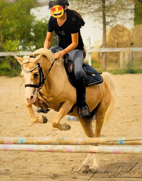 Super sweet PALOMINO push button mare Experienced in 60-75cm competitions with a kid. 100% healthy, straight and beautiful, with a rare coat colour and beautiful conformation. The perfect pony to win competitions on. Aiche Bel is 128 cm tall. She is ambitious, obedient, careful about the riders aids and very willing under saddle. She likes working and jumping. Isn’t scared of any kinds of colourful jumps. During competition courses she tries her best to help out her rider ad work out the distances. She also has very pretty movement with a relaxed shoulder and uphill cater, a great prospect for dressage. She presents a really efficient jumping technique and moves like a “normal” sport horse and not an average pony. She is used to lunging and ground work, she can be ridden bridleless and is perfect on trail rides. She is a charm to transport and walks into the trailer without any problems. Likes being groomed is very polite and really careful around children. She’s been handled and groomed by young (around 5-6 year olds) children without any problems. She is really respectful when it comes to children and adults also holding her hooves up on her own not to put too much weight on the person grooming her. She doesn’t have any weaknesses, is completely healthy, never been seriously injured, and is completely sound. Regularly vaccinated and dewormed, under the close eye of local vets, dentists and farriers. Will be a great riding and sport pony as well as a broodmare. She has had two beautiful foals that are also available for sale. Aiche is a lovely mare looking for her own kid. Although selling her is an extremely hard thing to do, we are aware that she needs a really petite rider whom we just can’t provide for her. That’s why we are looking for a really loving home for this pony. For her kid she is willing to do anything and is extra ambitious. That is why we are looking for a home where she will have only one rider and wouldn’t want to sell her to be a riding school pony. Because of the emotional attachment to this horse we are being careful about who will become her next owner. For the right person her price can be negotiated :)) For the same reasons we are selling her two daughters which both can be seen in one of the photos we would love to send them together to the same home. All the horses are currently in a stable near Wroclaw Poland and can be visited there.