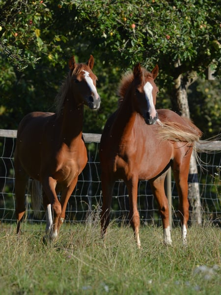 Welsh B fillies with full papers born 04/2024 Sire: Cadlanvalley Deluxe Dam's sire: Breeton Toy or Tidj Vliet's Amadeous Premium foals at ZfdP 2024 For sale are two exceptionally typy Welsh B yearling fillies from 2024, colorful chestnuts, one filly with a roan coat and a white spot on her side. Kienbergs Grandiosa Deluxe and Kienbergs Dalia Deluxe have been raised in a species-appropriate mixed-age herd, educated according to their age, and both are friendly young ladies. Full papers from ZfdP. Interesting for breeding, sport, shows, and leisure. Price stated per pony; if they can move out together, significant negotiation possible.