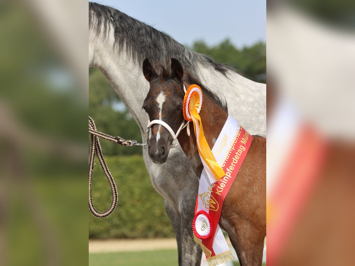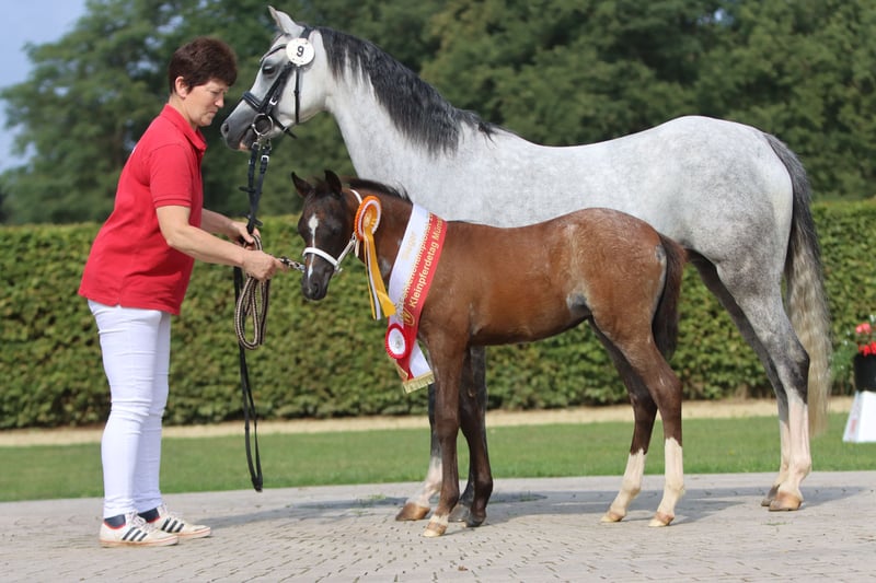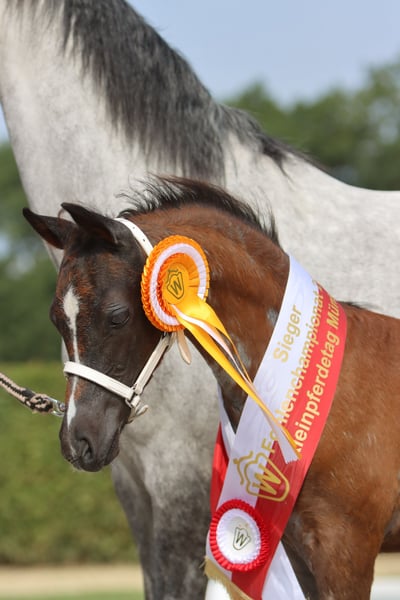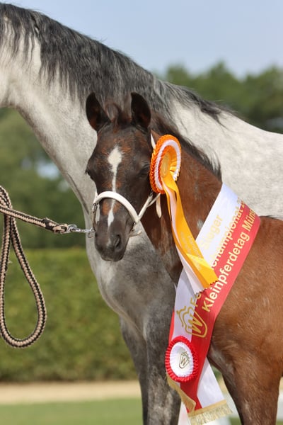St. Tropez is the 2nd foal by Samorens Katinka. Like her half-sister, she received the gold bonus and became a champion foal at the Westphalian Small Horse Show in Münster. Her sire Santiago already has several licensed sons and association premium mares, several auction foals and several highly successful offspring up to class M and Bundeschampionat participants. St. Tropez is built quite correctly and has impeccable character. She knows the foal ABC. The last 3 photos are not yet the parents Samorens Katinka and Santiago. Photos: Jandke /Grede/Hecker