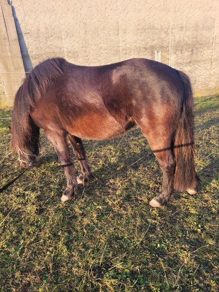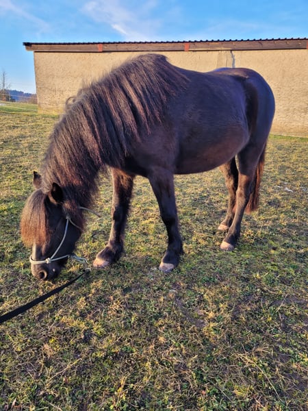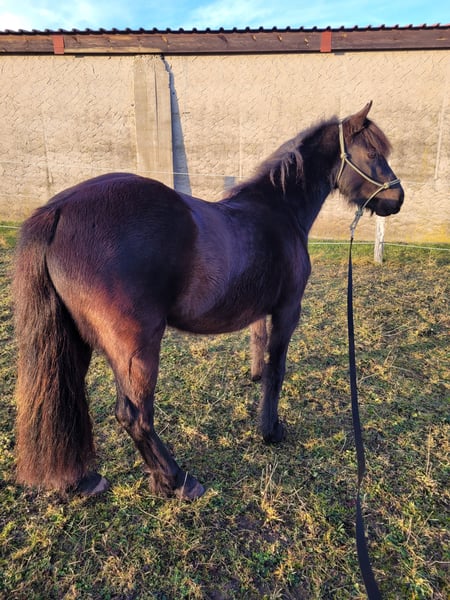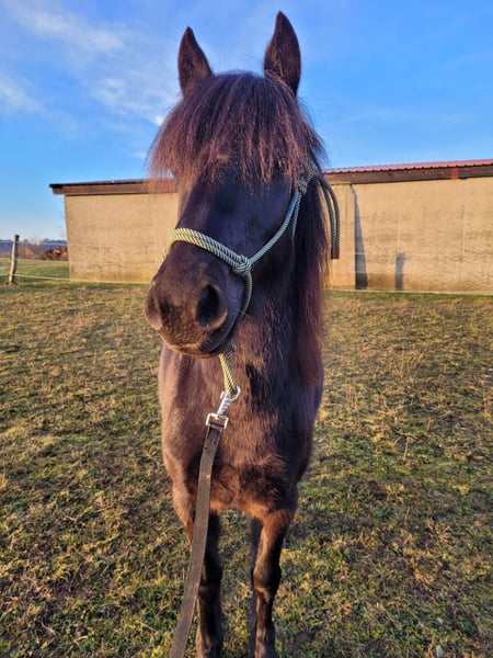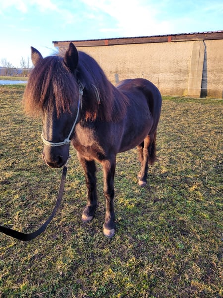 A new home is sought for our three-and-a-half-year-old black pony mare. She currently measures 1.28 meters at the withers. She is very sweet, friendly, and fearless. She approaches new situations with interest and curiosity. She is accustomed to lunging, can be confidently led away from the herd alone, and knows the basics of foal training as well as everything a pony of her age should know, making her ready to begin her training as a riding pony. Please feel free to contact us if you're interested or have any questions!