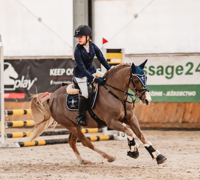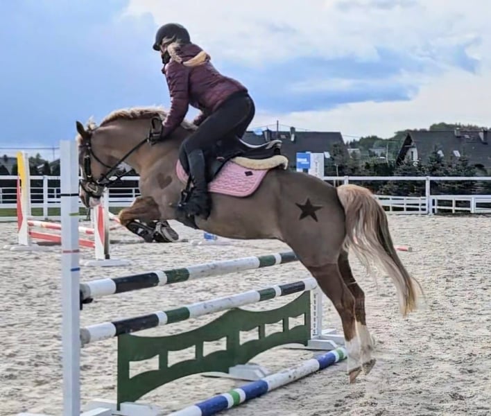 Kuc Vossie. Wzrost 133 cm. Zawody skokowe na poziomie 80 cm. Zawody ujeżdżeniowe na poziomie L, przygotowany do P. Nie dla początkującego jeźdźca. Delikatny na pomoce. Chodzi sam w tereny. Padokowany w stadzie. Chodzi w karuzeli. Osobom zainteresowanym filmy wyślę na what's apps. Brak aktualnego TUV, posiadam zdjęcia z 2021 roku.