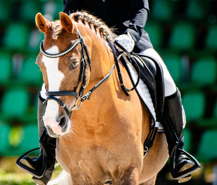 Kuc Vossie, ca. 1,33 m Stockmaß. Springwettbewerbe bis 80 cm. Dressurwettbewerbe auf L-Niveau, vorbereitet für P. Nicht für Anfänger geeignet. Zart im Umgang mit den Hilfen. Er geht selbstständig ins Gelände. Hufe auf einer Herde. Er läuft in der Karussellbahn. Bei Interesse sende ich gerne Videos per WhatsApp. Aktueller TUV liegt nicht vor, ich habe Fotos aus dem Jahr 2021.