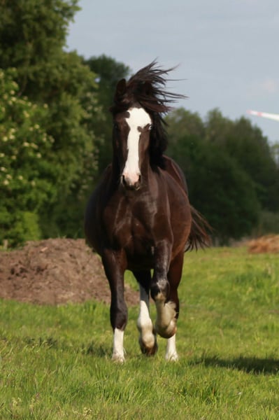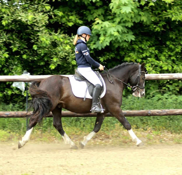 Here comes one for all. Othello is the perfect family pony. He is easy for children to ride and shows great willingness to perform without getting hot. Safe in the jumping course, on the eventing track, and in the dressage arena, he is the ideal pony for ambitious children whose parents also want to ride along. He has been with us since he was 1.5 years old and has been gently trained. He is barefoot, has never been sick, and has beautiful coat hair. Loading, clipping, and handling, he is simply a gem, especially with his two half-blue eyes that make him truly special.